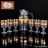 Кувшин 1,5л. и 6 бокалов 200 мл, стекло расписанное золотом. Нельзя мыть в посудомоечной машине! Нельзя применять образивные моющие средства, рекомендуется мыть в воде не выше 40 градусов.