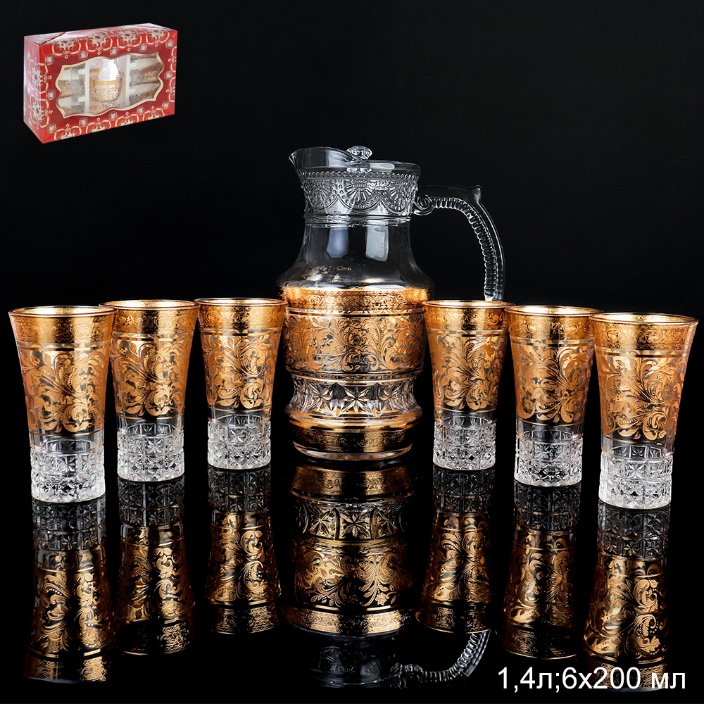 Кувшин 1,4 л. и 6 бокалов 200 мл, стекло расписанное золотом. Нельзя мыть в посудомоечной машине! Нельзя применять образивные моющие средства, рекомендуется мыть в воде не выше 40 градусов.