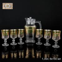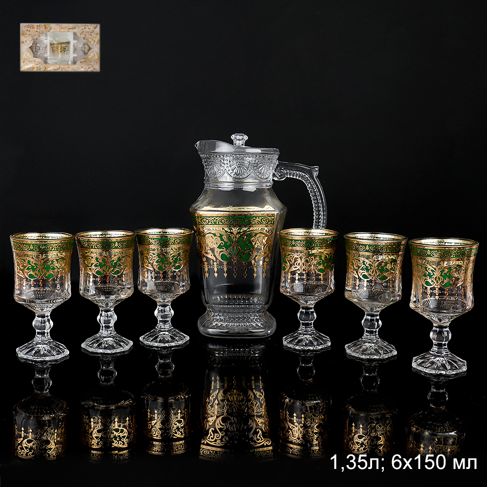 Кувшин 1,35 л. +6 бокалов 150 мл, стекло расписанное золотом. Нельзя мыть в посудомоечной машине! Нельзя применять образивные моющие средства, рекомендуется мыть в воде не выше 40 градусов.