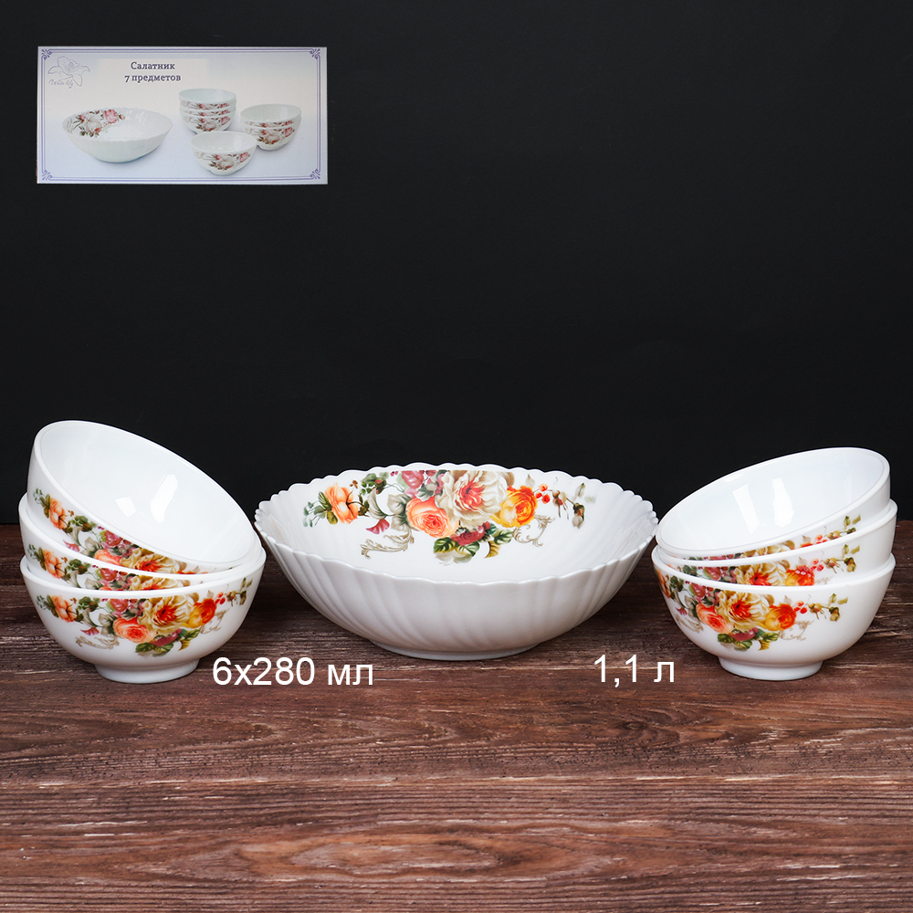Салатник 7 предметов, стеклокерамика.Посуда отлично выглядит при сервировки любого стола и отзывы от покупателей на такие блюда только положительные. Узнать цену и купить блюдо Посуду оптом и в розницу Вы можете в нашем интернет магазине в Челябинске. А также в другиих городах, таких как Оренбург Уфа Курган Омск Тюмень Екатеринбург Самара Пенза Никольск Гусь Хрустальный и других. Доставка во многие города России бесплатная