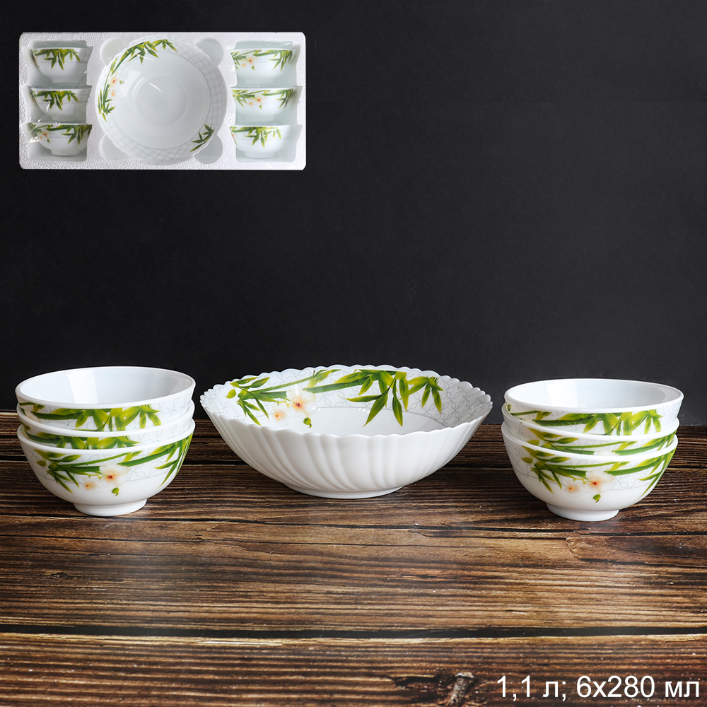 Салатник 7 предметов, стеклокерамика. Посуда отлично выглядит при сервировки любого стола и отзывы от покупателей на такие блюда только положительные. Узнать цену и купить блюдо Посуду оптом и в розницу Вы можете в нашем интернет магазине в Челябинске. А также в другиих городах, таких как Оренбург Уфа Курган Омск Тюмень Екатеринбург Самара Пенза Никольск Гусь Хрустальный и других. Доставка во многие города России бесплатная