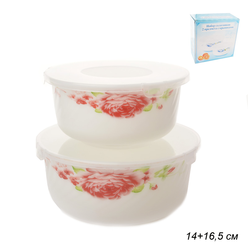 Салатники выполнены из высокопрочного материала- стеклокерамики. Стеклокерамика по своему составу и технологии производства гораздо ближе к стеклу, чем к керамике (это стекло с добавками, которые делают её непрозрачной). Посуда из стеклокерамики визуально похожа на фарфор. Обладает хорошей устойчивостью к механическим повреждениям. Подходит для использования в СВЧ печи, в посудомоечной машине. Используется как форма для холодца