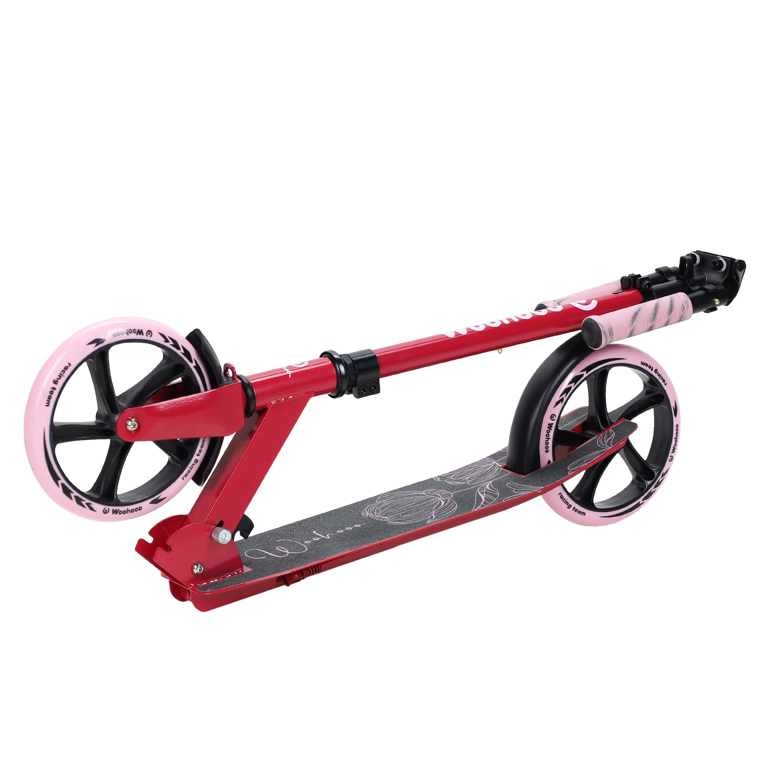 Особенности: складная конструкция, телескопический руль, антискользящая дека, ножной тормоз, подножка, поворот руля 360°