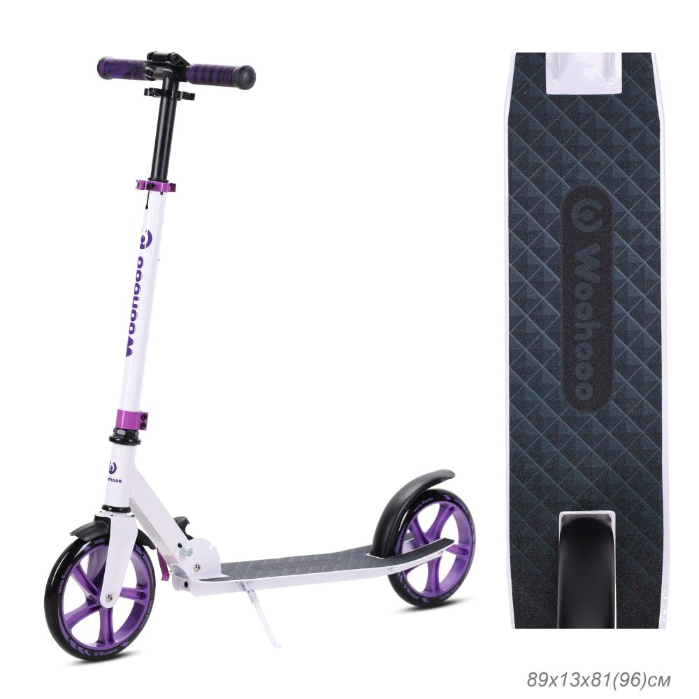 Особенности: складная конструкция, телескопический руль, антискользящая дека, ножной тормоз, подножка, поворот руля 360°