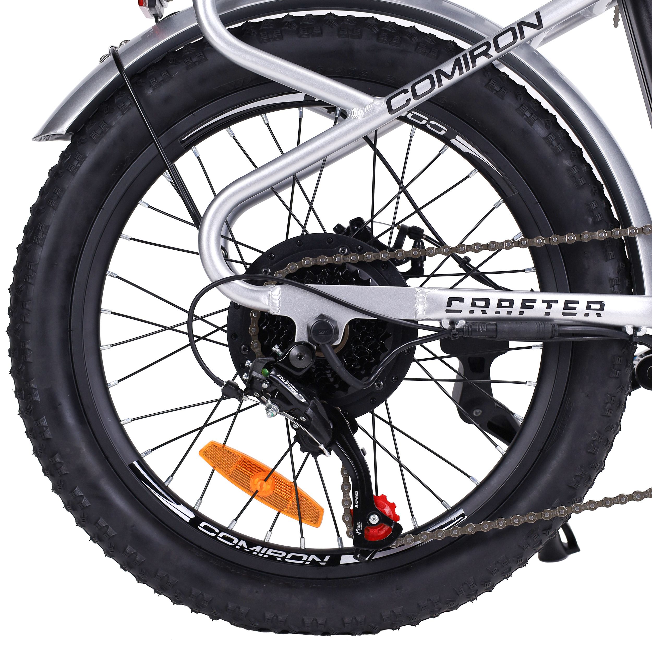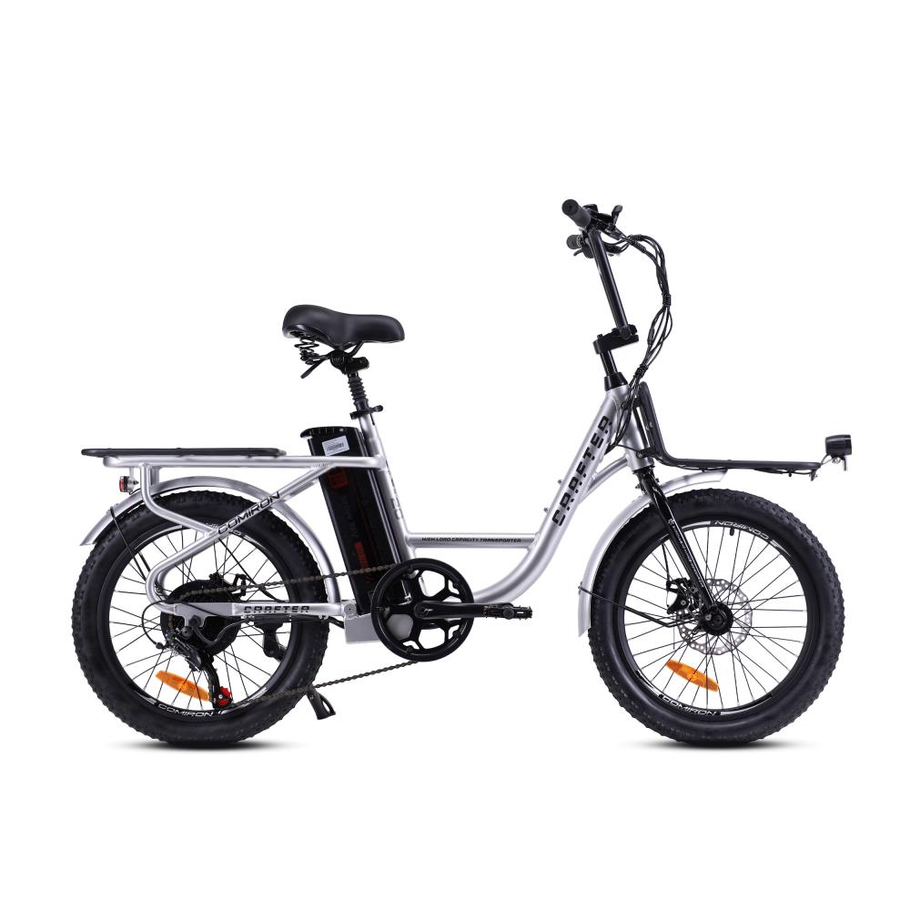 Грузовой электровелосипед Comiron CRAFTER на колёсах 20”, 7-скоростной трансмиссией SHIMANO, мощной батареей 36V/10.4AH и мотором на 350W, на мощной раме с мощными багажниками сзади и спереди.